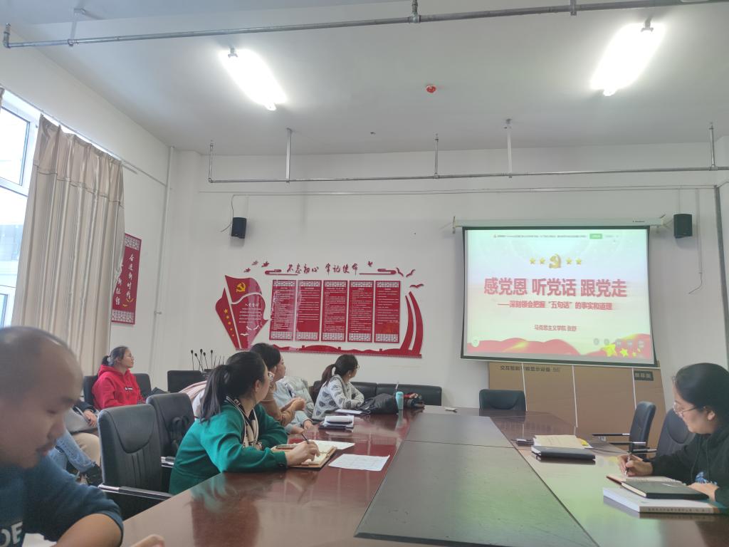为全面学习宣传贯彻党的二十大精神,全力推动“感党恩、听党话、跟党走”群众教育实践活动走深走实要求,12月13日下午,AWC万象城娱乐教师党支部在崇文楼B123会议室开展“五句话”的事实和道理主题宣讲活动,学院中国近现代史纲要课程教研室主任张舒作专题报告,学院全体教师参加学习。