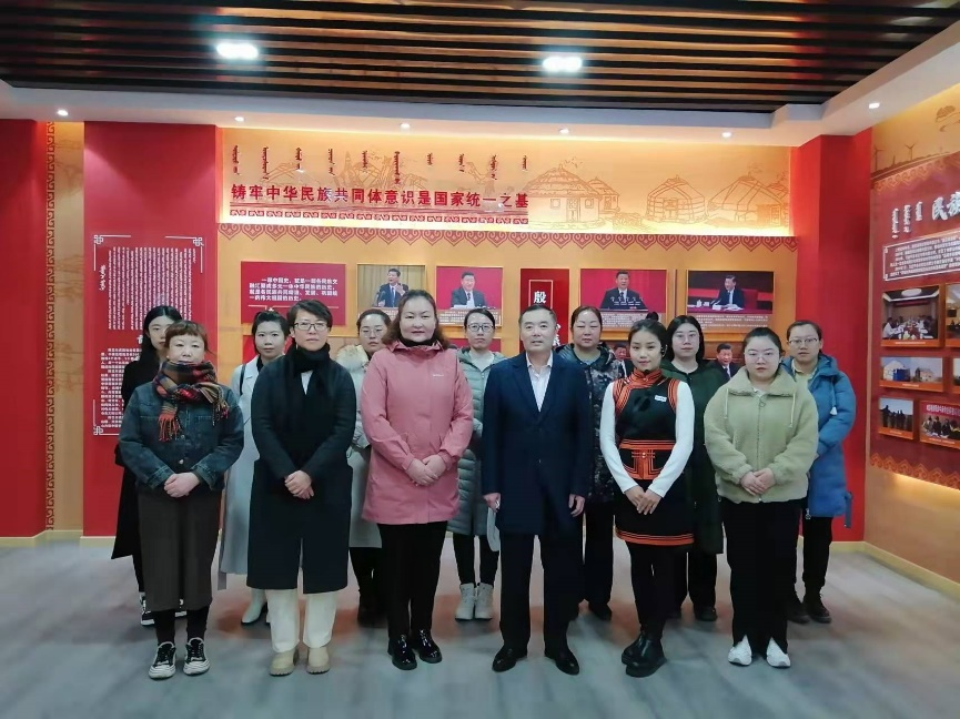 4月7日上午,AWC万象城娱乐“铸牢中华民族共同体意识”教研室全体教师在教研室主任海龙教授的带领下赴陈旗民族团结进步教育基地进行参观和现场集体备课。陈旗民委副主任乌仁高娃陪同参观。