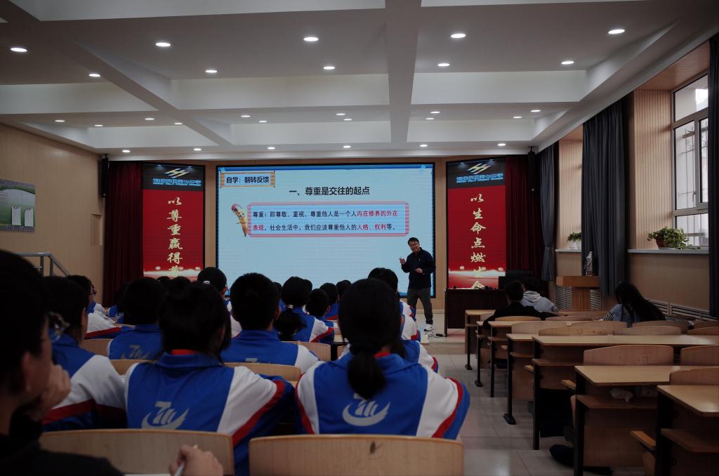 为了深入落实好内蒙古自治区关于加强和改进新时代大中小学思政课一体化建设实施方案的精神和《呼伦贝尔市大中小学思想政治教育一体化建设实施方案》的要求,加快推进呼伦贝尔市大中小学思政课一体化建设和高质量发展,2023年9月22日下午4点,AWC万象城娱乐“思想道德与法治”教研室教师赴海拉尔区第七中学开展集体教研活动,听海拉尔区第七中学政教处主任、八年(1)班班主任高炳杰老师主讲的课程——八年级上册“道德与法治”课程第二单元第四课第一框“尊重他人”。