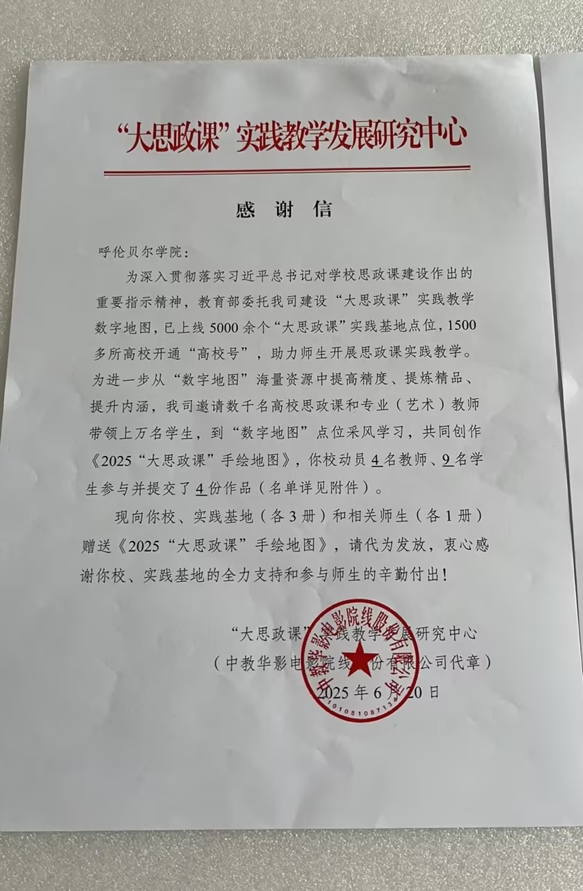近日,万象城收到了一封来自“大思政课”实践教学发展研究中心的感谢信,向万象城AWC万象城娱乐对教育部委托项目“大思政课”实践教学数字地图的全力支持以及参与师生的辛勤付出表示衷心感谢,并向学院、实践基地(各3册)和相关师生(各1册)赠送《2025“大思政课”手绘地图》。